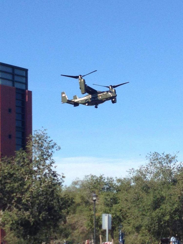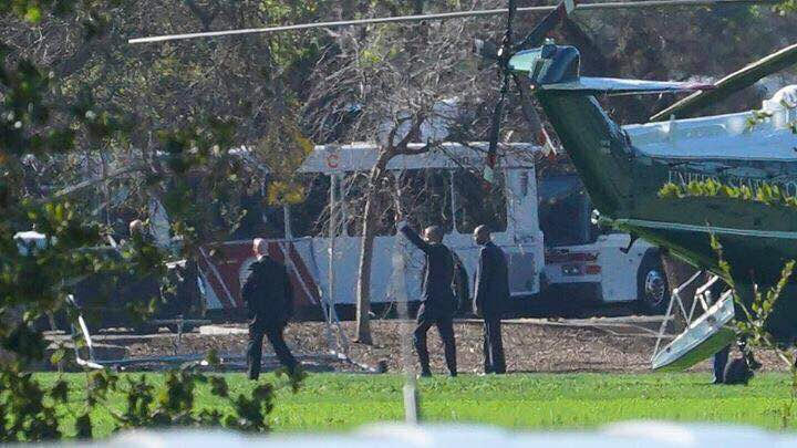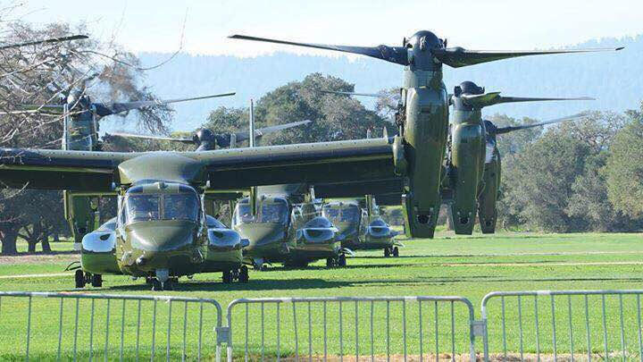 补充:以下四张照片是奥巴马乘坐的“海军陆战队一号”(Marine One)总统直升机以及几架护航机。有没有看到长焦镜头中的总统?据称奥巴马到斯坦福大学是来参加网络安全高峰会,并签署新的网络安全法案的。
