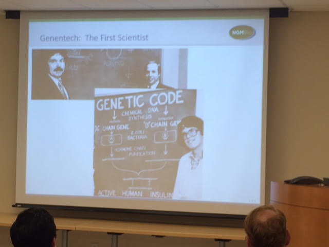 9、演讲者介绍湾区生物医药领域发展的历史演变。著名公司Genentech在1976年最初由UCSF的一名教授和一名风投吃饭时拍板创办,启动资金五百美元!可惜那张支票没有拍下来。