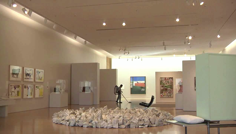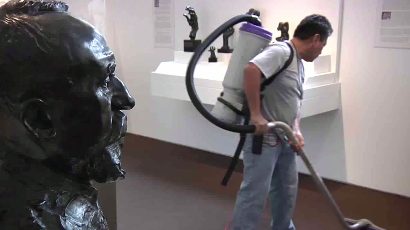 这是加西亚在打扫斯坦福坎特艺术中心。大量的艺术品和这个孤独的异乡人形成了极其强烈的反差。
