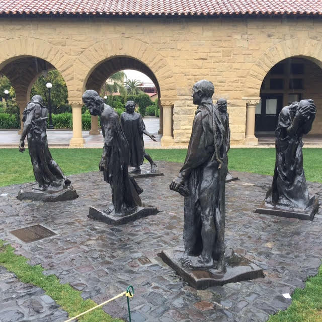 大家最熟悉的斯坦福大草坪后大教堂前也有一组雕塑,作品名为《加莱义民》,表现的是14世纪英法百年战争时期,六位加莱市民悲壮就义的场景。大家可以看到六人神态动作都不相同。在被围困将近两年后,为满足英军苛刻条件保全城市,六位市民手持城门钥匙出城,光头、赤足、锁颈,任由英军处死。