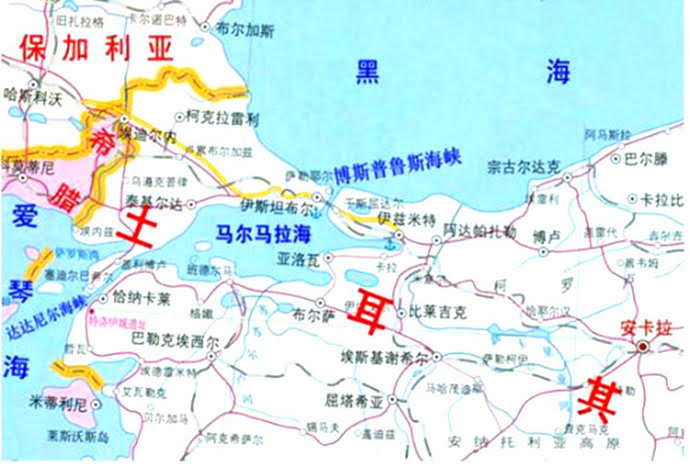这后面两海峡又称土耳其海峡,正好把土耳其分成欧亚两部分。尽管土耳其大部分领土在亚洲,但它头号城市伊斯坦布尔由博斯普鲁斯海峡上的桥梁连接在欧亚两岸,且他们一向自认为欧洲人,连亚运会都不参加。