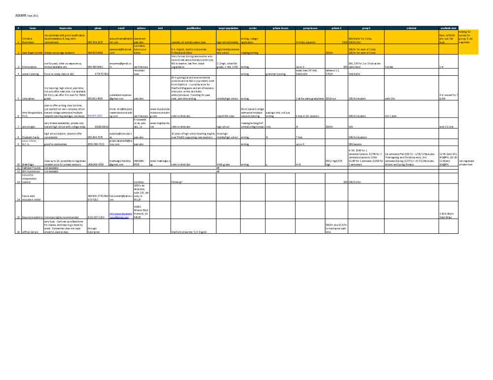 以下这个单子是几年前的一个总结,列出了本地(南湾硅谷一带)十几位tutor及他们的联系方式、教学特点、收费情况、经验背景等。这个单子肯定不全面,肯定还有很好的tutor被遗漏了,而且几年过去了,情况或许有变化。当时本虾和几位家长除了综合判断和选择tutor之外,还把十几个孩子按年级和水平分成了不同的小班(每班三到四人),师从二三个不同的老师。小班制的好处是:学生可以有互动和借鉴,有助于共同促进和提高。