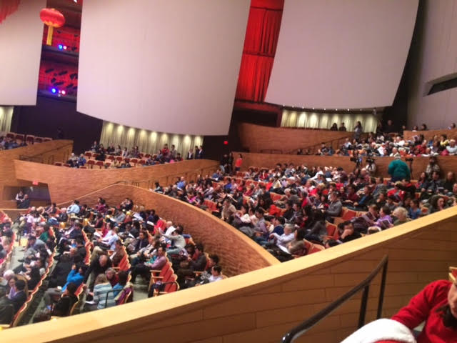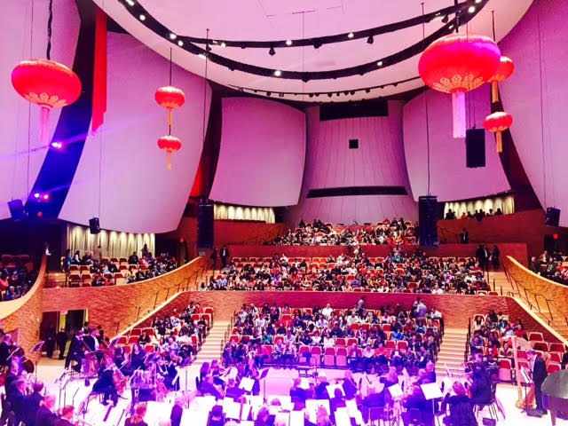 音乐大厅的设计特别适合演奏,观众高高在上地坐在四周,乐池台是在整个大厅中间较低的位置。由于这次音乐会的主题,大厅的装饰有很强的中国节日气氛。