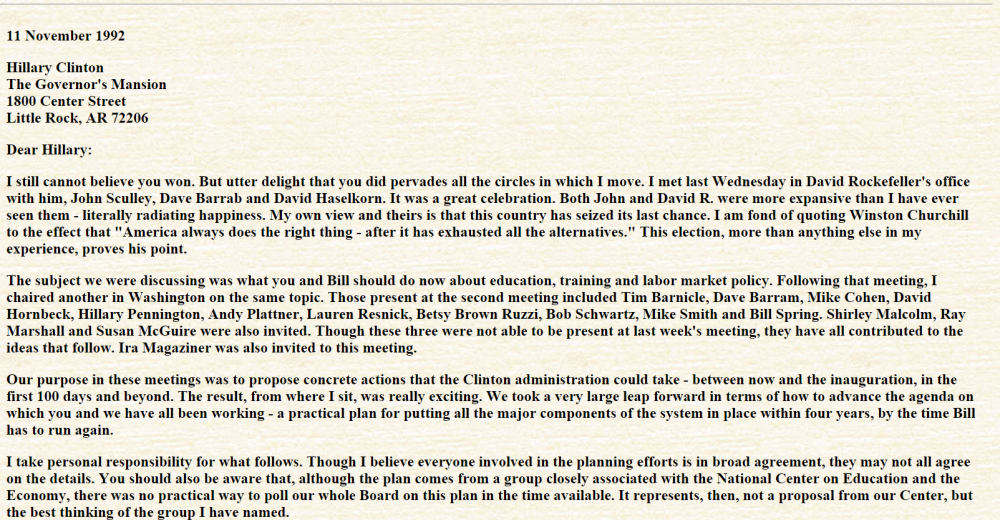 在信的开头,Tucker表达了克林顿的当选是美国千载难逢的一次全面改革美国教育与社会的机会:“我个人也是大家的见解是,美国抓住了它的最后的机会,用我非常喜爱引用的温斯顿丘吉尔的一句话来说,‘美国总是做对了事 -- 在穷竭其所能之后’”。这个机会就是将希拉里推崇的深度学徒制人力资源发展规划加以升华,“重塑整个美国人力资源发展系统”,建立“一套对每一个人 -- 包括年老和年少、穷人和富人、工人和学生 -- 的统一的从摇篮到坟墓的技能培训的精密无缝的大网”。Tucker建议彻底重组小学和中学,重启教育改革,建立国家化的教育标准和考试体系,学生在16岁时参加国家标准考试,若考试合格可获得“普通教育证书(general education certificate)”;获得此证书的学生将继续享有两年高中和一年大学的三年免费教育,这三年的免费教育是一种学术课程和职业培训的结合,学生毕业后可获得一种亚于本科文凭的职业和技术证书 (professional and technical certificates)。这个教育计划的目标是80%以上的美国学生都将按这种轨道获得某种大学文凭,其中大多数是这种三年制的高中与职业培训结合体颁发的“大学”文凭。鉴于民调显示所有的家长都希望自己的孩子能上大学而不是被筛选进与大学分道扬镳的学徒制的职业培训轨道,Tucker希望通过这样一种三年制亚本科“大学”文凭既能实现希拉里的学徒制人力资源发展的政治构想,又能得到怀抱大学梦的家长和民众的普遍支持。通过这种三年制“大学”的学习和职业训练,大部分的学生将获得应有的技能加入产业大军。同样水准的教育和职业训练的机会也将提供给社会上的失业和再就业人员,如此就业服务体系与学校教育系统将合并一体,从而使得人人皆可获得从前只有少数人才能享有的“大学”教育机会。全国的中小学教育标准、课程设置和教学方法都将与这一国家化的人力资源发展体系挂钩,以实现一个将所有的学校和所有的工作场所连接一体的“无止境的技能发展的无缝对接系统”。作为整个战略的一部分,Tucker还着重强调了要建立涵盖全体学生、各级学校、全体劳工、职业培训机构、就业服务机构和所有雇主单位的全面详细的数据库。