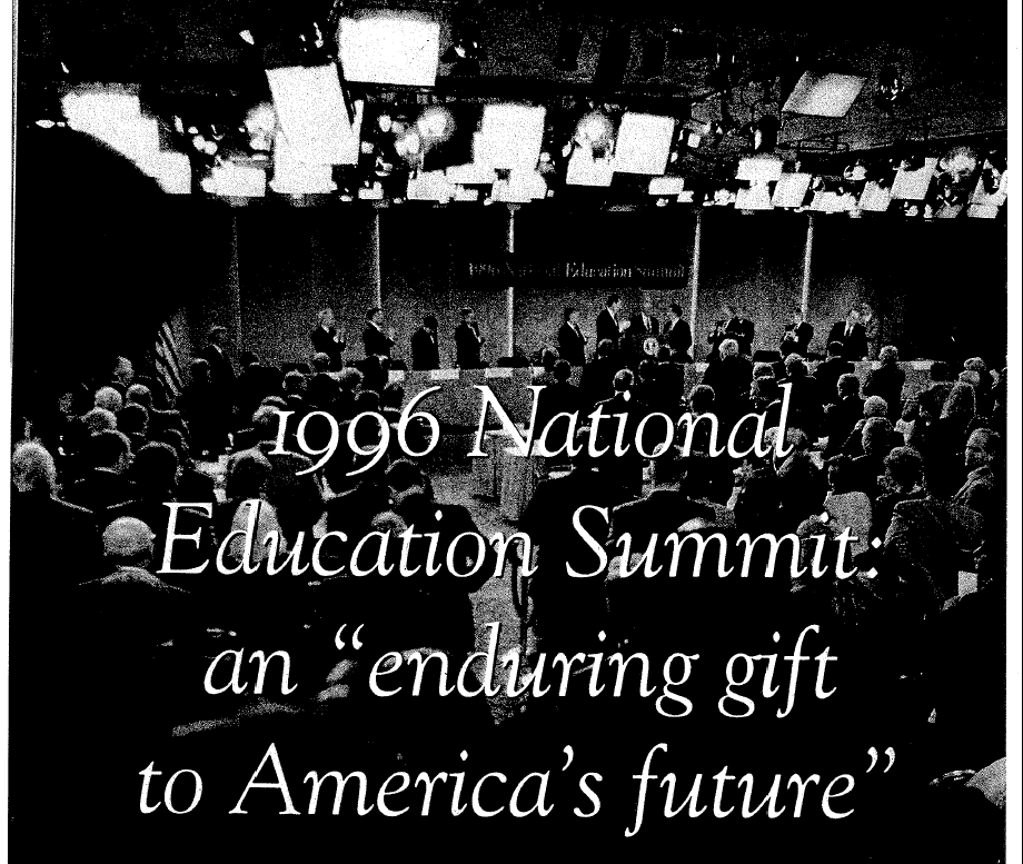 按照峰会上的承诺,几个月后,一个由六位州长和若干商业领袖牵头的名为Achieve的非政府组织在华盛顿如期诞生,其宗旨是帮助各州提高学术标准,改进测试系统,增强问责制度。该峰会纪要里有一张大字图片:“1996全国教育峰会:一个给美国未来的恒久礼物”。Achieve就是这次峰会给美国民众留下的一个影响深远的礼物。自它成立以来,Achieve的成员们就夜以继日地筹划Tucker国书中所描绘的全国一盘棋标准化教育改革的各项事务,是未来奥巴马时期推出的美国历史上首个国家性的教育标准“共同核心标准”(Common Core)的策划、制作和推广基地。这一年,拥有康奈尔大学法学学位和儿童早教本科学历的Susan Pimentel作为顾问入了Achieve, 她是日后Common Core的英语标准的主要执笔人。