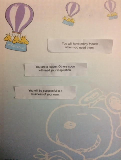 我先打开了我自己的,上面写道:You will have many friends when you need them. (你需要的时候会有许多朋友)。这个好!人生走到现在,夫复何求?