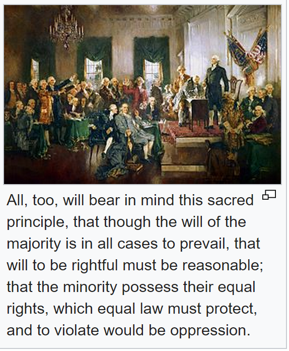 1801年,杰弗逊在总统就职演讲中阐明:“所有人也要牢记这一神圣原则,虽然总是多数人的意愿占上风,这意愿须合理方属正义;少数人拥有同等的权利,法律必须给予平等的保护,违反少数人的权利即为压迫。” 由卢梭的个人服从集体的社会契约观和均贫富的绝对平等观发展而来的民粹主义,其特征即是简单粗暴的“少数服从多数”,虽然表面上以一个抽象整体的“人民”为核心,实际上最缺乏对公民个人基本权利的尊重,对组成“人民”的一个个具体的“人”持轻视和压迫的态度。奉行的卢梭式的平均主义的Tucker等人简单粗暴地忽略“少数人”的学术需要,此举违背了美国联邦宪法精神中的平等的要义。