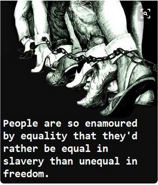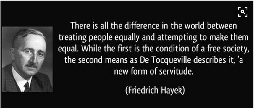 哈耶克说:在世界上,“平等地对待百姓”和“试图使百姓平等”这两者之间存在根本性的差别 -- 前者是一个自由社会的条件;后者如托克维尔(De Tocqueville,1805–1859)所言,是“一种奴役新形态”。我们已经看到,进步教育专家追求整齐划一的中庸学术成就的百年教育乌托邦实践,造就了美国的以谎言和胁迫维持的公共教育系统,广大学生成了这个奥威尔式的畸形教育系统的牺牲品。美国极左势力的政治欲求则是一种追求社会和经济状况的结局平等的乌托邦政治实践。历史表明,追求绝对平等的乌托邦实践均以极权主义的血腥暴政和生灵涂炭收场。民主宪政国家走向以均贫富为目标的国家集体主义的路径同样将是一条“通往奴役之路”(the road to serfdom)-- 个人将被统治高层集体或被整个社群所奴役,其运作模式仍如奥威尔所示:上层以社会公正的名义,过度征收中产阶级的劳动所得,交由上层的统治集体手中,然后重新分配给较少劳作或较少产出的底层百姓群体,换取他们的选票,以维护上层的统治和特权地位。国家集体主义下的大政府大社会,必然会导致政府权力的膨胀和腐败,因为任何人,无论是一个人还是一个集体,无论多么崇尚美德,多么像罗伯斯皮尔那样“sea-green incorruptible”, 一旦掌握了政治权力,其天然趋向就是滥用这个权力,天然地倾向于用权力来谋求私利,巩固自己的统治地位,侵害他人和社会。奥威尔言:“无论怎样强调都不过分 -- 实际上人们总是强调得太少了 -- 集体主义天然不是民主,相反,它赋予了少数专制者西班牙宗教审判所的审判者都从未梦想过的权力”。
