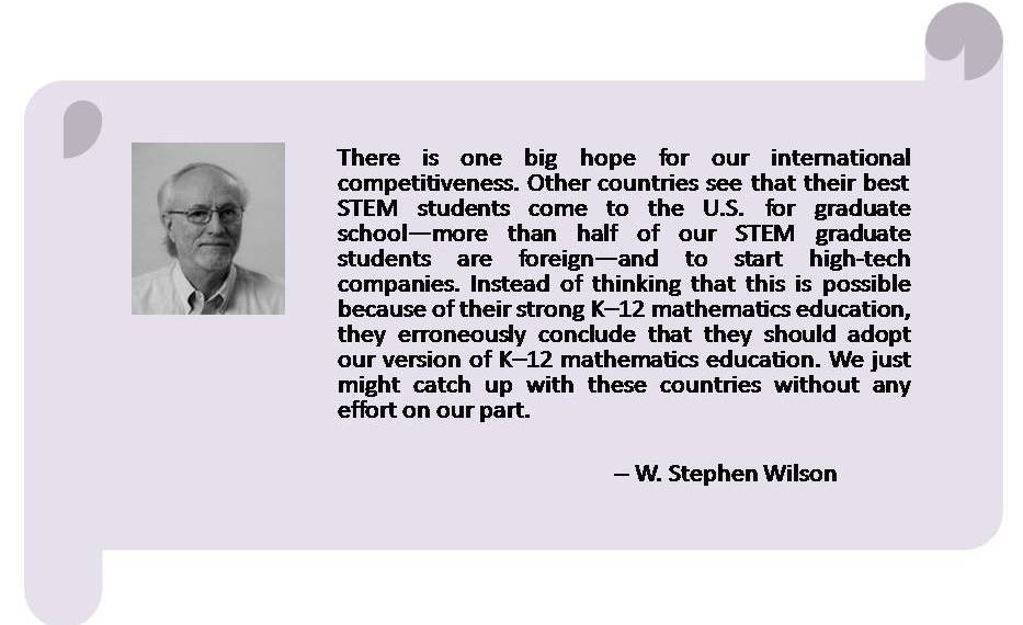 “我们美国梦想的国际竞争力有个很大的希望:现在其他国家最好的理工科学生都来美国上研究生,创办高科技公司— 美国理工科研究生中一多半都是外国学生。他们没有意识到这是因为他们的K-12数学教育很强,而是错误地论断他们也应该采用我们的K-12数学教育模式。那么我们不用费任何气力,就终于能赶上这些国家了。”