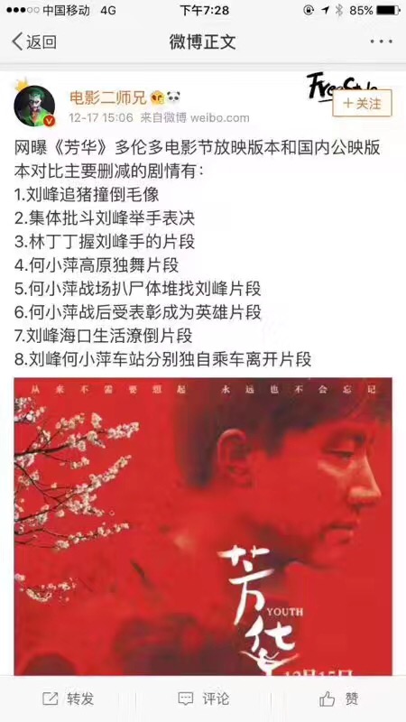 上周六去库市AMC看了《芳华》。这个大影院据说是王健林买下的,视觉音响效果的确很好,可惜的是,居然还是放了删节版。据说全片共有多处达12分钟的删节。