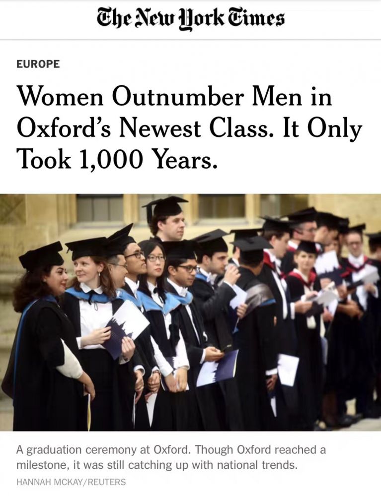 今年初,《纽约时报》发表一篇文章,报道说,接近1000年历史的牛津大学,今年入学的新生中女生人数第一次超过了男生。根据牛津大学公布的数据,今年入学新生中,女生是1070人,男生1025人。