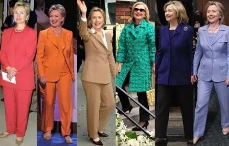 《纽约时报》专栏作家范妮莎·弗里德曼就曾敏锐地发现,希拉里开始参与到美国总统竞选过程后,就慢慢抛弃了自己的服装特色:“橘色和翠绿色不见了;深紫红和柠檬黄不见了;樱桃红、紫红色和青绿色不见了。她套装的这些代表颜色都不见了。偶尔也会突然出现红色和蓝色,但是现在这些颜色更多属于例外,而非常规。她似乎不仅把自己与前上司奥巴马的某些政策捆绑到一起,而且也与他的服装策略捆绑到了一起:每天都只穿灰色或蓝色套装。”