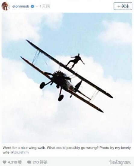马斯克在一架飞行中的双翼飞机上“悠闲”漫步。