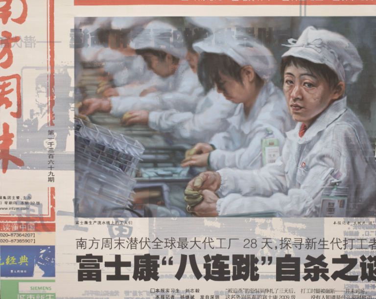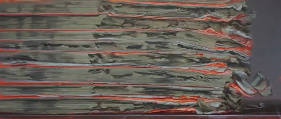 下面这幅画是正反视角系列之一,报纸背面若隐若现透出的文字图案,和正面内容形成强烈的对比反差。