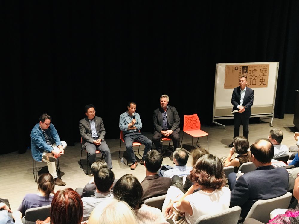 讲座开场白由斯坦福大学艺术及艺术史系教授Richard Vinograd作介绍,讲座后半段是panel discussion (炉边谈话),由美国C-Lab基金会执行董事涂强博士主持。谈话在多位重量级人物间展开,他们是Vinograd教授、谢晓泽、专程飞来的清华文化创意发展研究院执行院长胡钰教授、美国敦煌基金会执行董事Christian Hudak四人。四人所代表的三家机构刚好就是活动主办方。