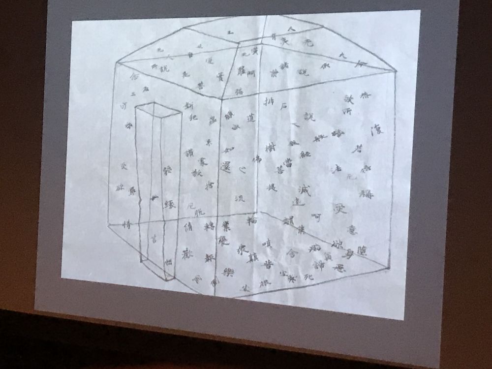 那些日子,谢教授用十几米的长卷记录了关于对藏经洞的想象。他在丁丁电视的访谈中说,“这幅长卷综合了我学习过程中的笔记、我引用的藏经洞中的经文或艺术品的片段、我根据藏经洞的历史产生构思的三维装置的草图,这是一个过程性的东西,可能不是一个成品,它只是我一个学习、体验、构思的一个过程。这幅水墨作品本身综合了图表、白描、书法,历史文件、佛教经典、佛教宇宙观这些内容,它本身除了是一个多种形式的雕塑或装置的草图之外,也是一个独立的作品。"