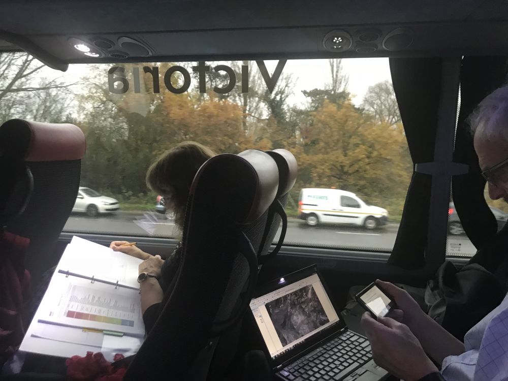 坐在伦敦和牛津之间的通勤大巴上,目力所及,车上每个人都在工作状态中。下面这张照片因为是偷拍,不太好意思,照得不太全。前排没拍上的那人在看一篇学术论文,中间的女士在钻研讲义,后面这位男士在准备PPT演讲slides。未入城,学术气氛就已扑面而来了。