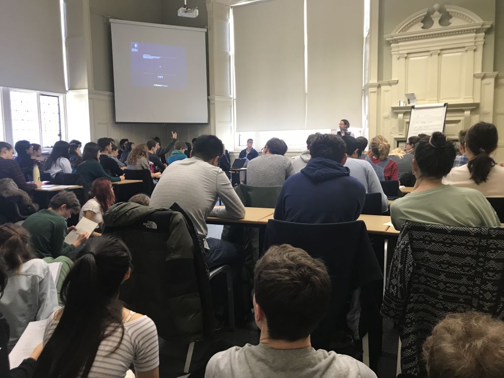 第二堂课是Moral Philosophy (道德哲学),临时换了个小教室,以致人满为患,许多人坐在了地上。讲师口若悬河,又常与学生互动,风趣幽默,时时引爆笑声。