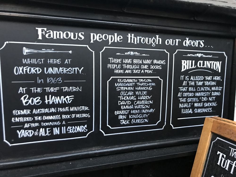现在来看看酒馆黑板上列的名人,密密麻麻。很显然,大字的就是巨牛:左边是前澳大利亚总理霍克、右边是比尔·克林顿。六十年代,克林顿作为牛津政经哲专业的学生,曾在这里"没有吸入" (did not inhale) 违禁物质。