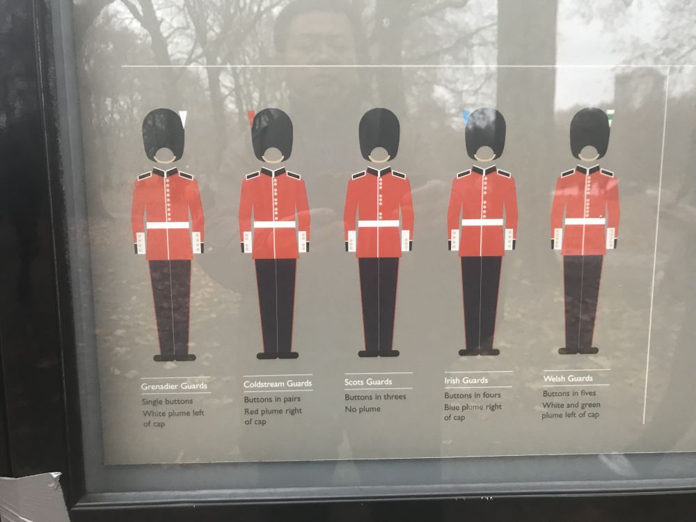 士兵之间的穿着也有区别,分别代表威尔士、苏格兰、爱尔兰等卫兵。下图显示这种微妙的不同,仔细研究才可看出区别来。