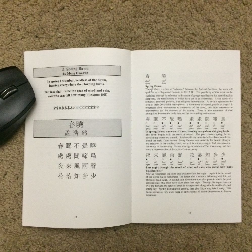 他精选的唐诗都是家喻户晓的名诗,翻译得也极精到。下面这张截图,孟浩然的《春晓》,大家可以体会一下。
