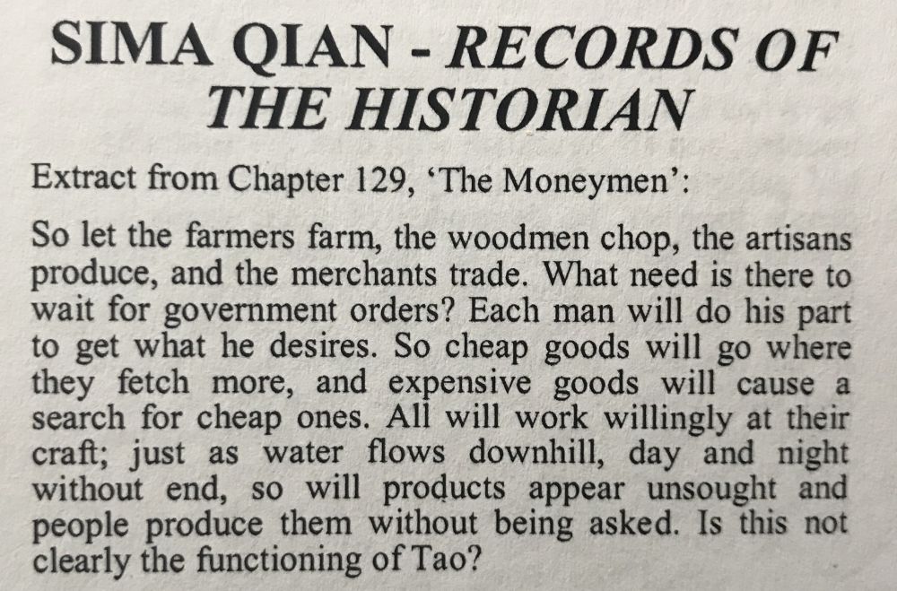 事后本虾查阅有关资料得知,Mr. Johnson并非妄言。史学界的确有论文在讨论此事,比如香港中文大学的经济学家、爱尔兰人L. 杨格就在《太平洋评论》上发表了论文《市场之道:司马迁与看不见的手》,他认为司马迁在《史记·货殖列传》中提出了市场机制概念和“看不见的手"的等价隐喻:“若水之趋下”。《货殖列传》阐述道,人力、物力都能得到充分的发挥和运用,人们的欲望都得到最好的满足,商品价格偏低则需求增加,从而最终导致价格上涨;商品价格偏高则需求减少,从而最终导致价格下跌。这样价格就可自发地对生产、供求和流通起着调节作用,就如同水往低处流一样,日夜都不会停止。不用召唤,财物就会顺时而至;不用强求,人们就会把它生产出来。这是“道之所符”(符合规律)和“自然之验”,不用什么“政教发征期会”(政令、征召、限期)就能自然而然实现的最好的结果。