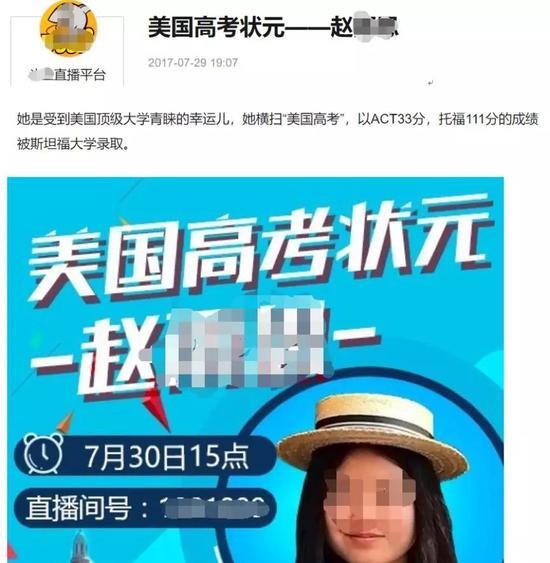 这个塞进去的孩子叫赵XX。她ACT只考了33分(满分36分),这个分数我儿子在初中就达到了。但这并不影响这个女孩吹牛,她自己搞了个直播,自称是美国高考状元。且不说美国每年ACT和SAT满分的学生上千名,就是满分学生也有许多被顶尖大学拒录的,因为美国的大学录取是综合评估(holistic review),除了看分数等学业指标外,还要看其它许多学业之外的表现。也就是说根本没有高考状元一说。