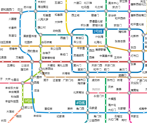 城市里的地铁一般是双线, 一个站台有两个不同方向的同一线路地铁, 但有例外。在下图中可以看到北京地铁的4号线和9号线, 它们在国家图书馆站交汇, 4号线由北向东南, 9 号线由国家图书馆站始发向南。在国家图书馆换乘站,4号线向北方向的车与9号线的终点站在同一个站台, 而4号线向东南方向的车与9号线的起点站在同一个站台。