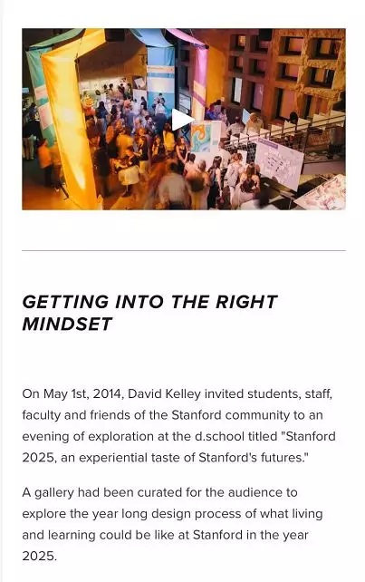 但是仔细搜索研究斯坦福官网,并没有看到如自媒体所说的斯坦福大学"宣布的"、"正式启动"的2025计划。本虾朋友、目前在国内从事创新教育的毕卓然老总搜集到了它原来的出处。2014年,斯坦福大学设计学院(D school)的创始人Kelly教授在2014年5月1号发起了一个畅想“斯坦福2025,未来教育体验”的活动,在这个活动中,设计学院提出了“斯坦福2025计划”。