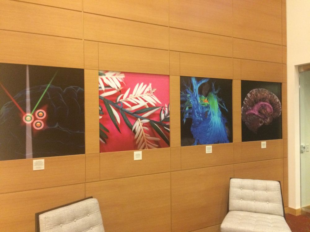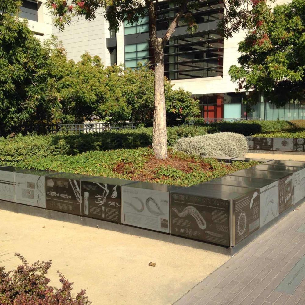 建筑物前面有一大排底座,每个底座上都是一幅图案,展示出斯坦福在人类科学史上所做出的突破性贡献,整个图案合起来就是一部科技发展的宏伟史卷。李嘉诚共捐赠3700万美元用于斯坦福医学研究项目,该建筑为其中一项。