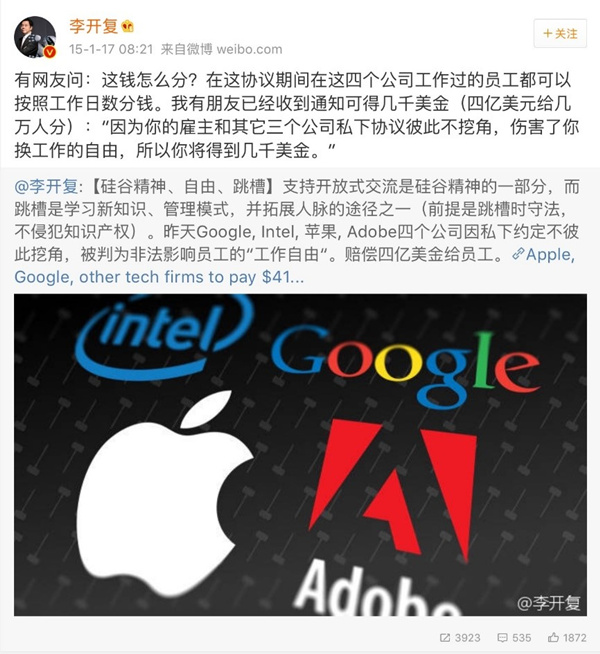 加州就没这个问题。整个加州无论是法规上还是文化上都对这种叛逆有着极大的宽容,体现在公权力和民间社会对此的理解和处理。2014年,加州四个巨头Google、苹果、Intel和Adobe被罚款4.15亿美元,因为他们之间私相授受,建立攻守联盟,订了个"君子协议",合伙对付加州这条劳工法,彼此承诺相互不挖墙脚。这就破坏了竞争,破坏了地区的活力,员工的自由也因此被侵犯。加州就对此做法大开杀戒。这个例子显示了法律的威力,其实也是公权力对叛逆的一种宽容。
