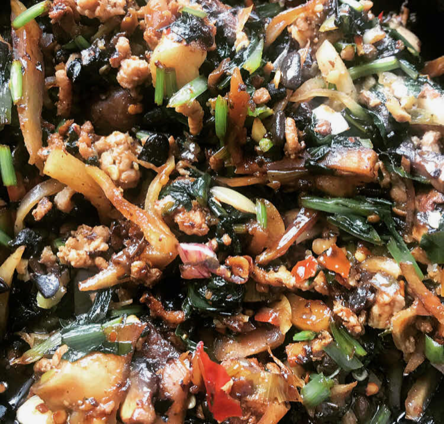 看着群里个个大显身手的巧妇们,我只能带着小的去山上摘野菜。好在春天的山里野蒜正是时候。回家把剩的一小把豆豉找出来,加了点儿肉末(最后一盒)在油里先炒香,放切碎的野蒜,一点点姜,大把干辣椒(去年种了没吃完挂起来晒干),花椒,尝尝觉得还是不够辣,又把去年腌的青辣椒放了一大勺。(这辣椒青的摘下,剁碎,放酱、盐、酒拌好装瓶,放冰箱里能吃好久),看看冰箱里还有一把香菜,怕坏了,也切碎倒进去,最后把半个月前腌的大头菜倒进去,加糖,生抽稍微炒一下,起锅。