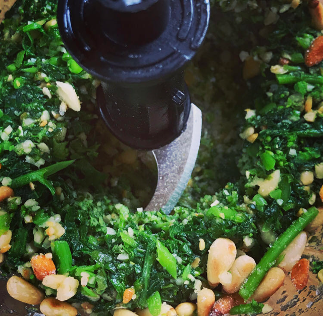这次严格按西式作法:摘500克蒜香芥末,(带花)洗净绰水,立马碧绿柔嫩,切成段待用。这边炒香100克松仁(好高级啊!),放凉。然后把蒜香芥末、松仁、一勺上好的橄榄油(又好高级啊)、少许盐,我创造性地放了点糖减轻野菜的苦味,在迷你搅拌机里打成酱。打的时候一股松仁香混着芥末味,洋气极了!这个带松仁香的芥末,蒜味其实不大,倒是芥末味很冲,而且苦味比较强悍,是那种人高马大的洋硬汉吃三分熟的牛排时抹上享用的。疫情当前,吃牛排有些太奢侈,复活节传统的要烤羊肉,我拿出这酱来,我们一家三口吃得很唏嘘。我安慰大伙儿说:天然有机不说,维生素含量超高,现在别的都没用,抵抗力是老大,谁维生素分泌旺盛,谁出门口罩都不用戴!