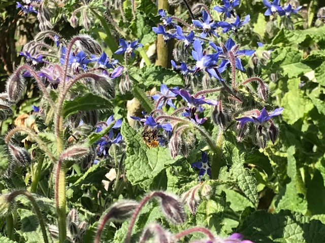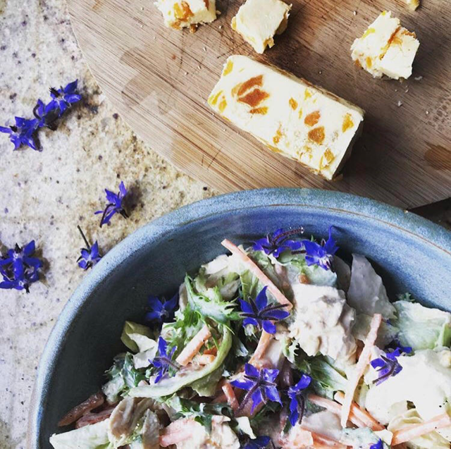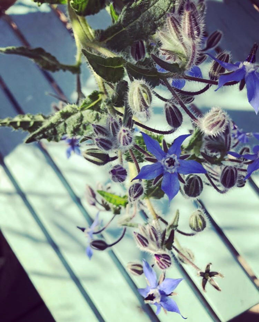 此野花名字古怪:琉璃苣。 叶子和花都能吃,味道有些像黄瓜,所以做沙拉是正道。我烤了几片鸡胸脯肉,晾凉,加带杏肉的奶酪(英国人加蓝奶酪,我真受不了!),生菜,樱桃西红柿,用蛋黄酱,苹果醋,少许盐和胡椒与琉璃苣花拌上,盐和胡椒酌情点缀。一点技术含量没有,但典型的小资,端盘上桌时要撒几朵花在上面,点题。