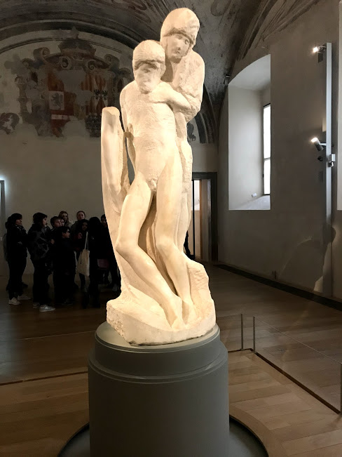 三年后,米开朗基罗81岁时又创造了第三尊圣殇雕塑,这次人称Palestri 圣殇,现存于佛罗伦萨美术学院。巧的是,它和自己的巅峰作大卫像在同一个博物馆,26岁的作品和81岁的作品交相辉映,对比中显示出青春的昂扬和暮年的睿熟。