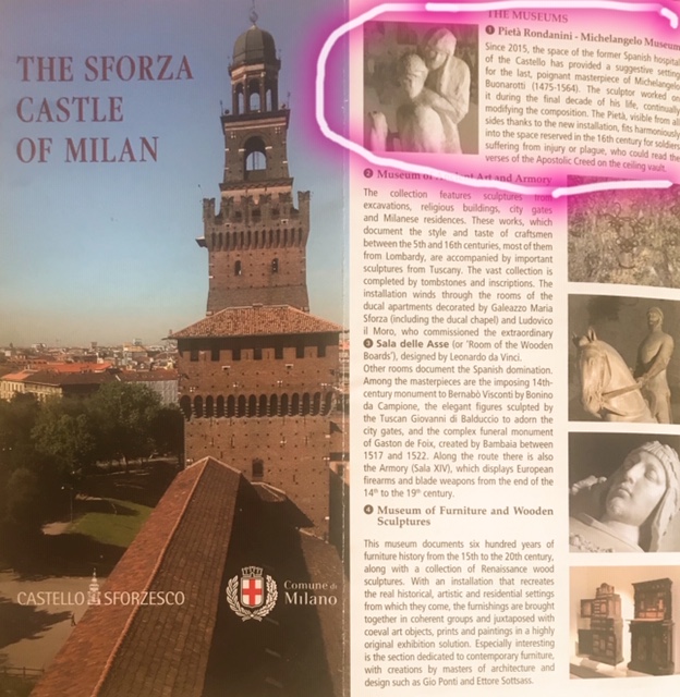 米开朗基罗也没想到此后他又活了八年。在生命最后的时刻,他以89岁的高龄迸发出伟大的光亮,创作了第四座圣殇,史称最后的圣殇,又称隆旦尼尼圣殇 (Rondanini Pietà),就是开头提到的藏在米兰斯福萨古堡的这件,古堡的宣传小册子第一个介绍的就是米氏的这件作品。