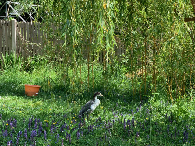 我到院子里一看,四只年轻的母鸭围着水塘喝水,吃草。公鸭一反往日和母鸭子们形影不离的常态,步履蹒跚地在走到花园尽头的柳树下,呆望着篱笆外面好久,然后就地把自己埋在长长的草里,一声不响。一天下来,它呆在那里不吃不喝,黯然神伤。