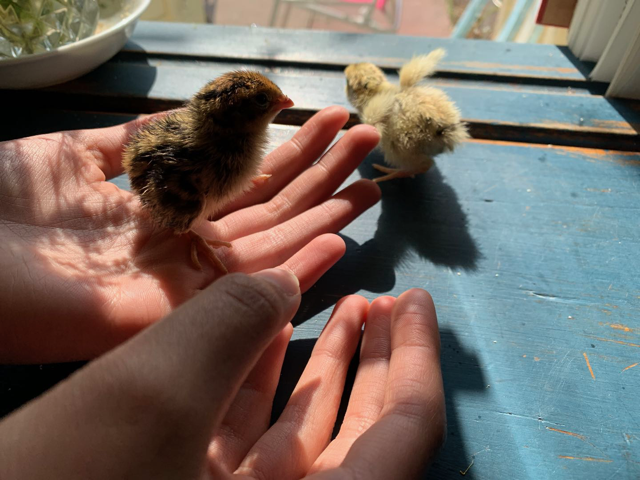 太阳好的正午,我喜欢把纸箱子端出来,把它们放在用网围起来的草坪上玩玩,晒晒,它们自然高兴地奶声奶气地又蹦又叫。有一次,趁我不注意,跟枣儿一样大的小鹌鹑神秘地失踪几只,草地上有毛和血迹,我看着细细的网,实在无法破解是什么东西钻进来拖走了它们。我这花园里最隐蔽的算是鼹鼠,但它也要打个洞才能出人头地啊!至今无解,只能加倍小心。