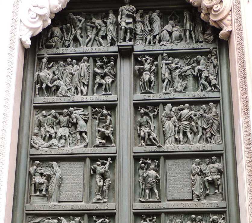 左一铜门铸于1948年,事涉《米兰赦令》(Edictof Milan)。公元313年,君士坦丁皇帝于米兰颁布赦令,使基督教合法化,自此该教定于一尊。此前犹太人及脱胎之基督教倍受罗马诸代皇帝欺迫。及至君士坦丁大帝时代,耶教却已渐成气候。313年决战前夜,天使托梦该皇,许胜于他,前提为皈依基督。果胜,于是皇恩浩荡,遂开启欧陆基督教时代。