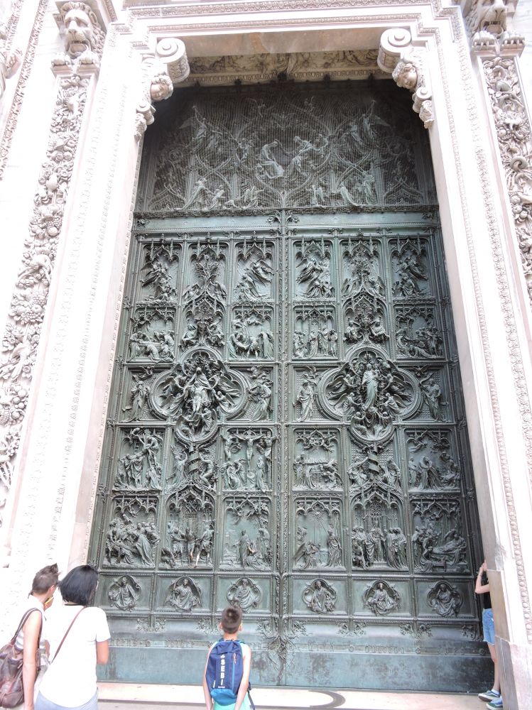 门重37吨,1906年行隆重之开门仪式,1950年完成。二战时米兰遭轰,天使左手被炮弹炸飞,圣母左肋与头顶破损,耶稣受难系列浮雕与弹痕同苦。