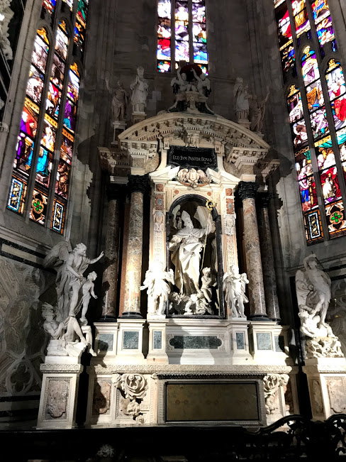 山不在高,有仙则名。欧洲各大名教堂,都得有个镇堂之宝。比如,威尼斯圣马可大教堂藏有圣马可遗体,普拉托Duomo教堂以圣母腰带为贵,都灵约翰大教堂供奉着耶稣的裹尸布,而梵蒂冈彼圣得大教堂也因存有耶稣大弟子圣彼得遗体之故而得其名。米兰大教堂不但高,而且也有仙,所以是高仙两全。
