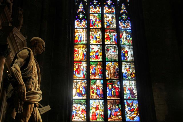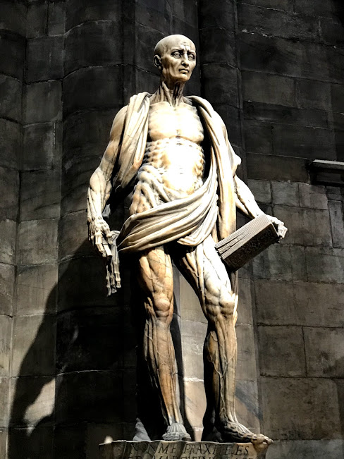 米兰大教堂内还立有一些大理石雕像,最惊悚的是这位巴塞洛缪,消瘦凹陷的一脸苦相,骨肉血管毕现。