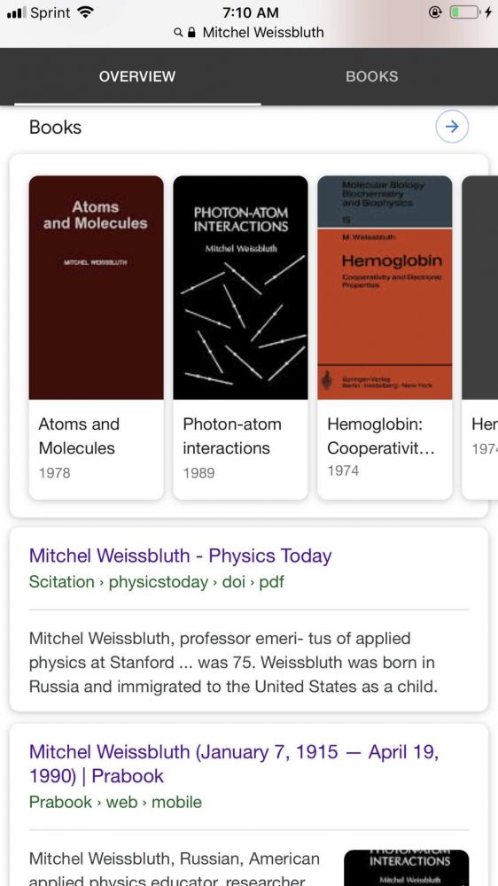 那天因为赶一个很急的报告,我迟到了20分钟,海云已先到了。老太太住在离我家很近的老人公寓里,见了我们话多的不得了,脑子极清晰,记性也很好。讲到年轻时候的事情如数家珍。她的先生Mitchel Weissbluth是斯坦福的著名物理教授,也是福布莱特学者,已于1990年去世。