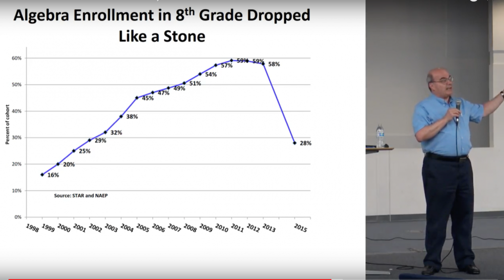 最后我还想说的是,对升入6年级和7年级要数学跳级的学生,PAUSD要求必须参加艰难的5小时资格考试。这些测试几乎比SAT的数学部分长4倍!当然,这些测试是非标准的,这样设计就是用来使得超前的孩子失败。回想一下,我们的邻近学区在8年级时有超过40%的学生在上几何课,而 PAUSD希望有0%的比例以符合他们取消分级的社会工程。