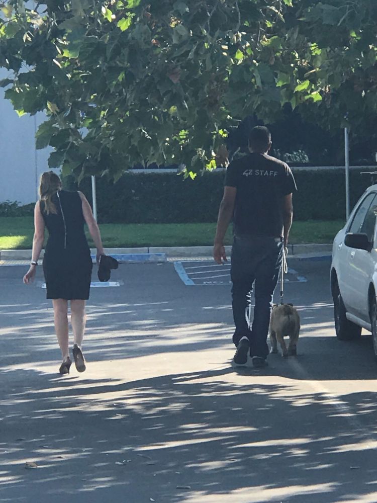 那里还有食堂,午餐晚餐供应挺丰富,也不贵。食堂和宿舍在不远的另一幢楼里。女儿带我去参观的路上,看到了学校第二号人物、创始人Kwame Yamgnane和一位女士坐在食堂外的小桌边。可惜出来时,他们已不在那里了,凑巧看到了他们的背影,就偷拍了一张那人那伴那狗。