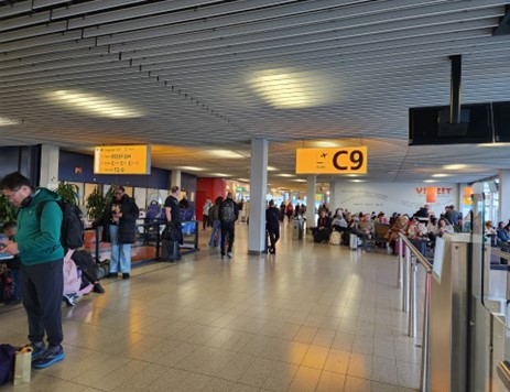 因为飞机延点, 抵达阿姆斯特丹时我们只剩两个多小时的转机时间,又因为要出关, 本来两个小时的宽裕时间立刻感觉有点紧张,再看几百号人在拉好的绳子中转圈圈, 一圈又一圈, 而服务窗口只有四个, 效率实在太低, 太慢。