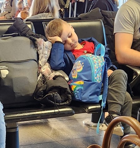 机场人很多, 很多, 嘈杂声不绝于耳, 猛回头看见一小男孩手托腮帮安然入睡,让人不觉抿然而笑, 喧闹中留一份宁静于世界。