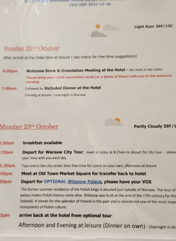 这个12日游的旅游计划,主要是去波兰的华沙和克拉科夫, 匈牙利的布达佩斯, 奥地利的维也纳, 斯洛伐克的布拉迪斯拉发, 以及捷克的布拉格这些著名的旅游城市。 除了旅游团规定的必去景点,还有6个 选项, 这六个选项都是另外付钱的, 先生从中选了4个,这样每日行程就非常满了。