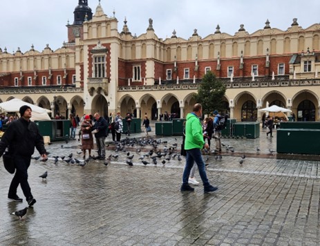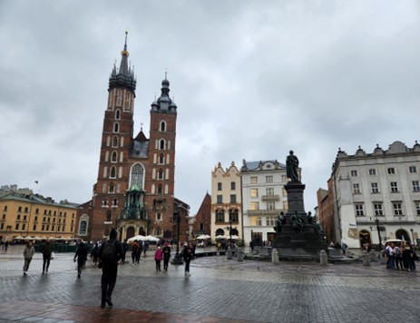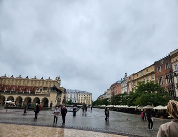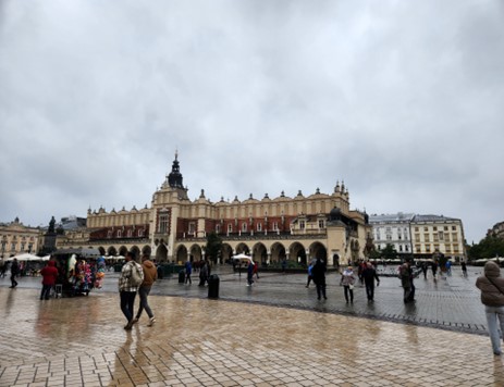 转完马加什大教堂, 导游带我们来到Krakow Main Market Square. 这是欧洲最大的市场, 建于13世纪,占地近10英亩, 是当时最大的民众娱乐和教堂聚集之地。因为这里没有被战争摧毁, 所有建筑物得以保存完好, 因此显得比华沙的老城漂亮壮观许多, 至今日, 依旧是民众游乐聚集之地。