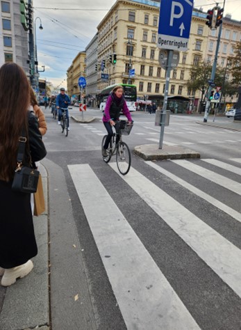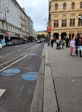 为环保,维也纳骑自行车的很多,马路上给骑车人留有很宽敞的车道,比美国的宽近乎一倍,而且行人不得走在自行车道上,行人有行人的道。